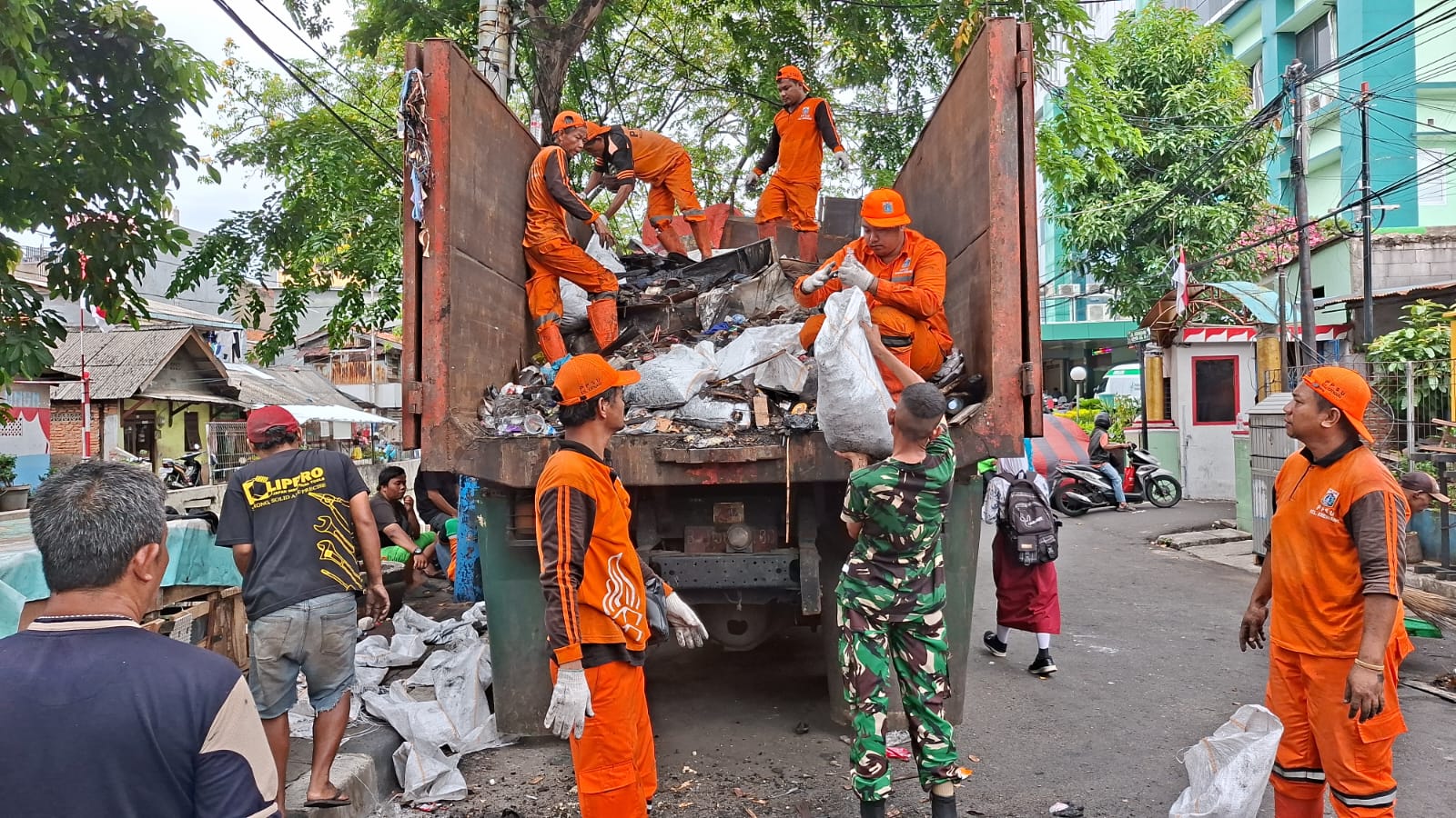 Mereka bergotong royong mengangkuti sampah dan puing-puing bekas kebakaran, seperti kayu, seng, besi, dan sebagainya.
