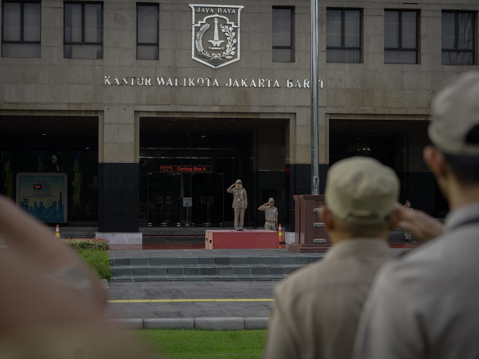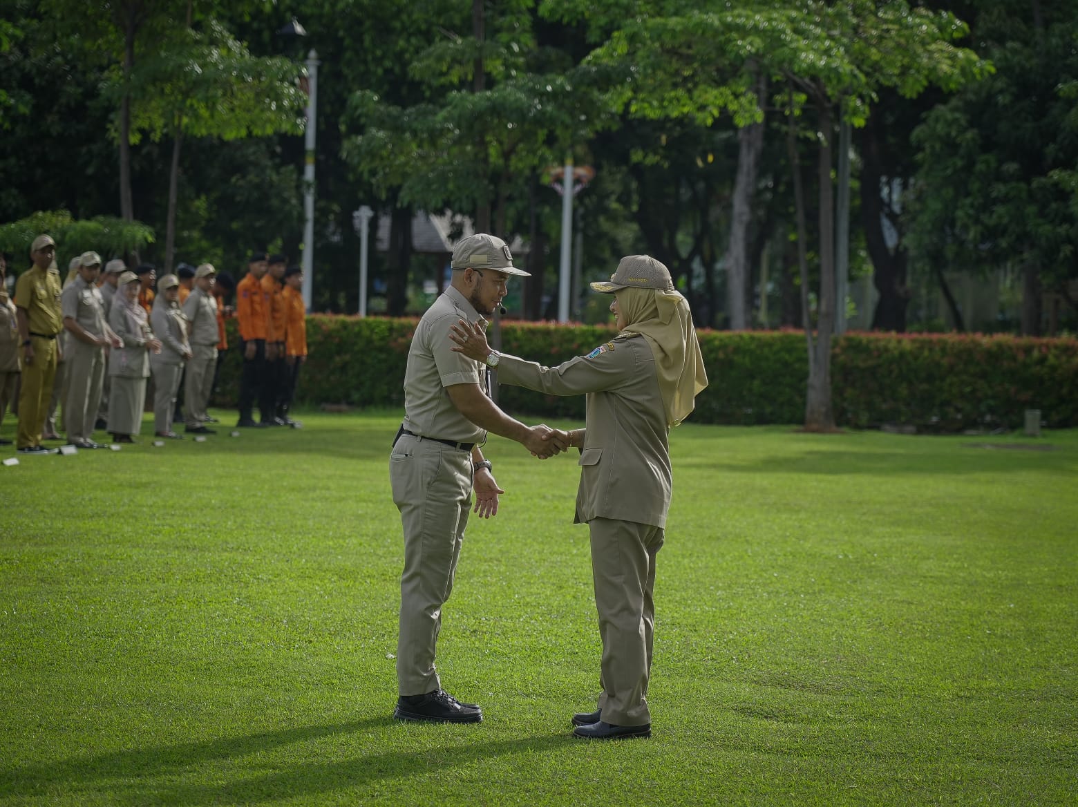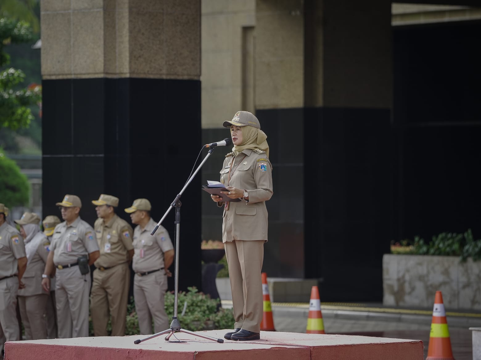 Wali Kota Jakarta Barat, Iin Mutmainnah, memimpin apel pagi di halaman Kantor Wali Kota Jakarta Barat pada Senin (29/12).