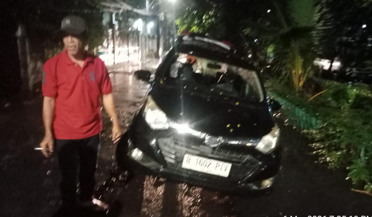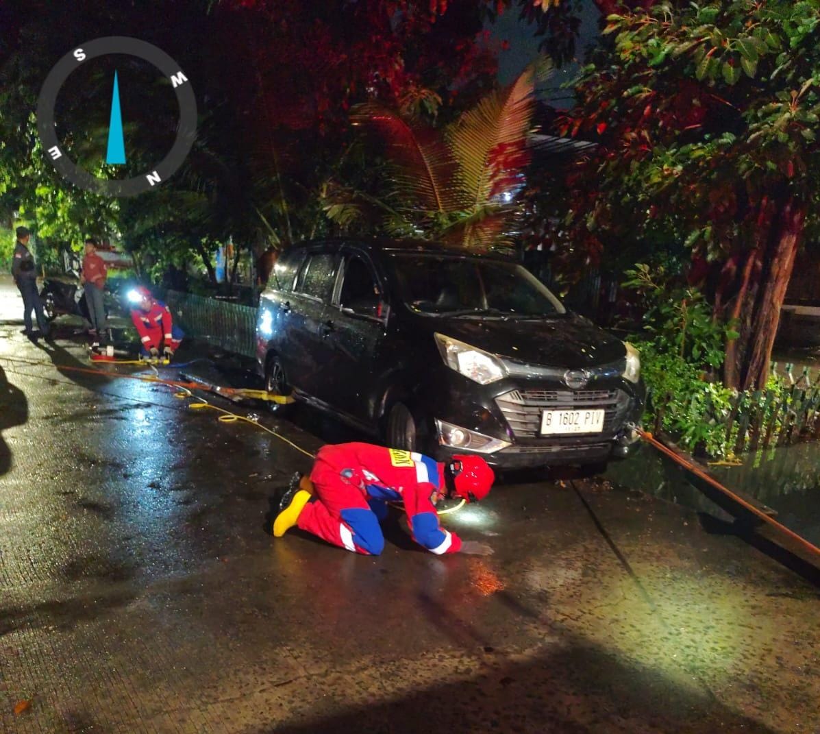 4 orang Tim Satpel Penanggulangan Kebakaran dan Penyelamatan Kecamatan Grogol Petamburan Kecamatan Grogol Petamburan bergerak cepat mengevakuasi mobil taksi online yang terperosok di selokan samping Kelurahan Jelambar di Jalan Hadiah Utama 1 F5, RT 06, RW 02, Kelurahan Jelambar (6/3)