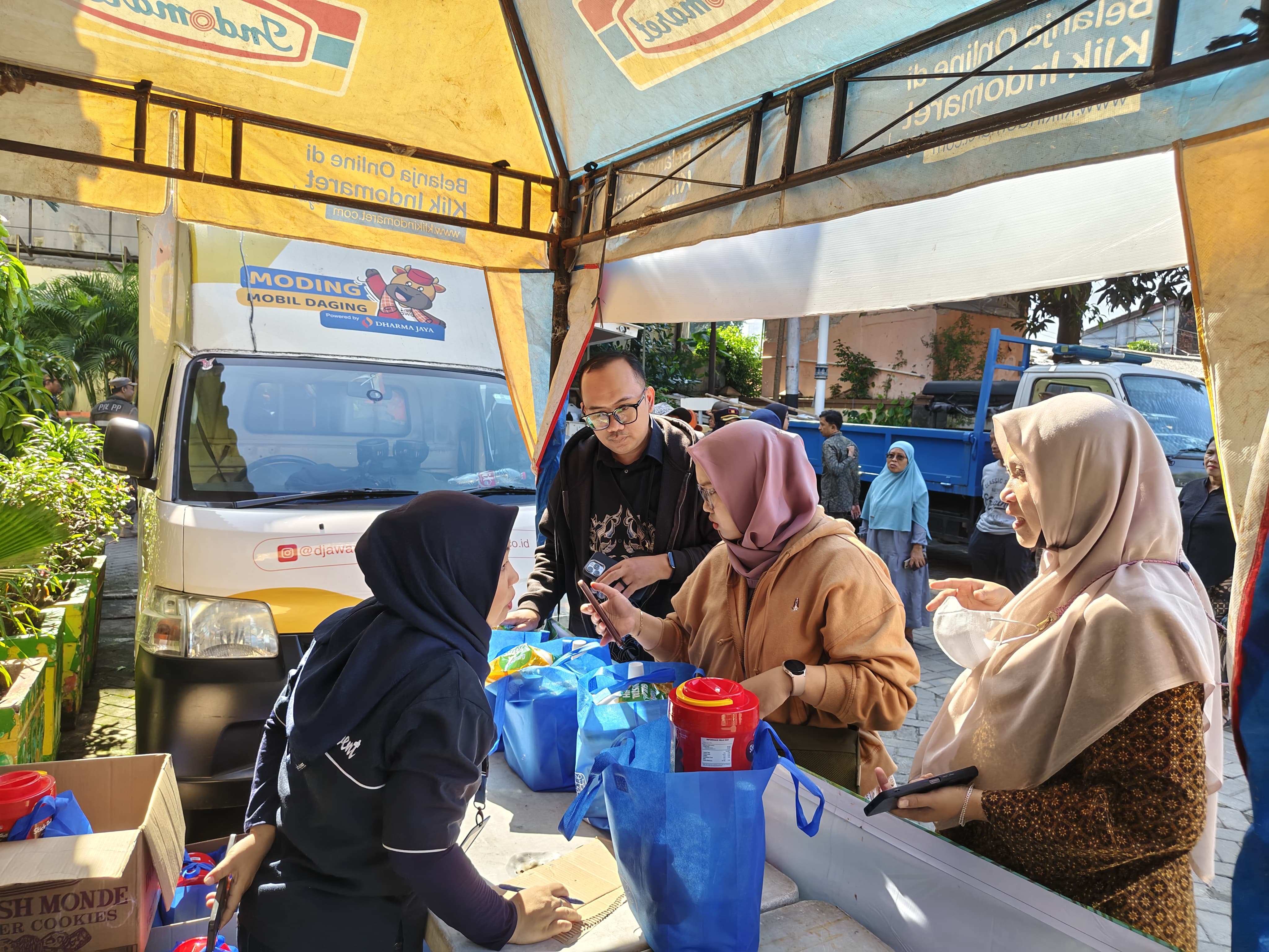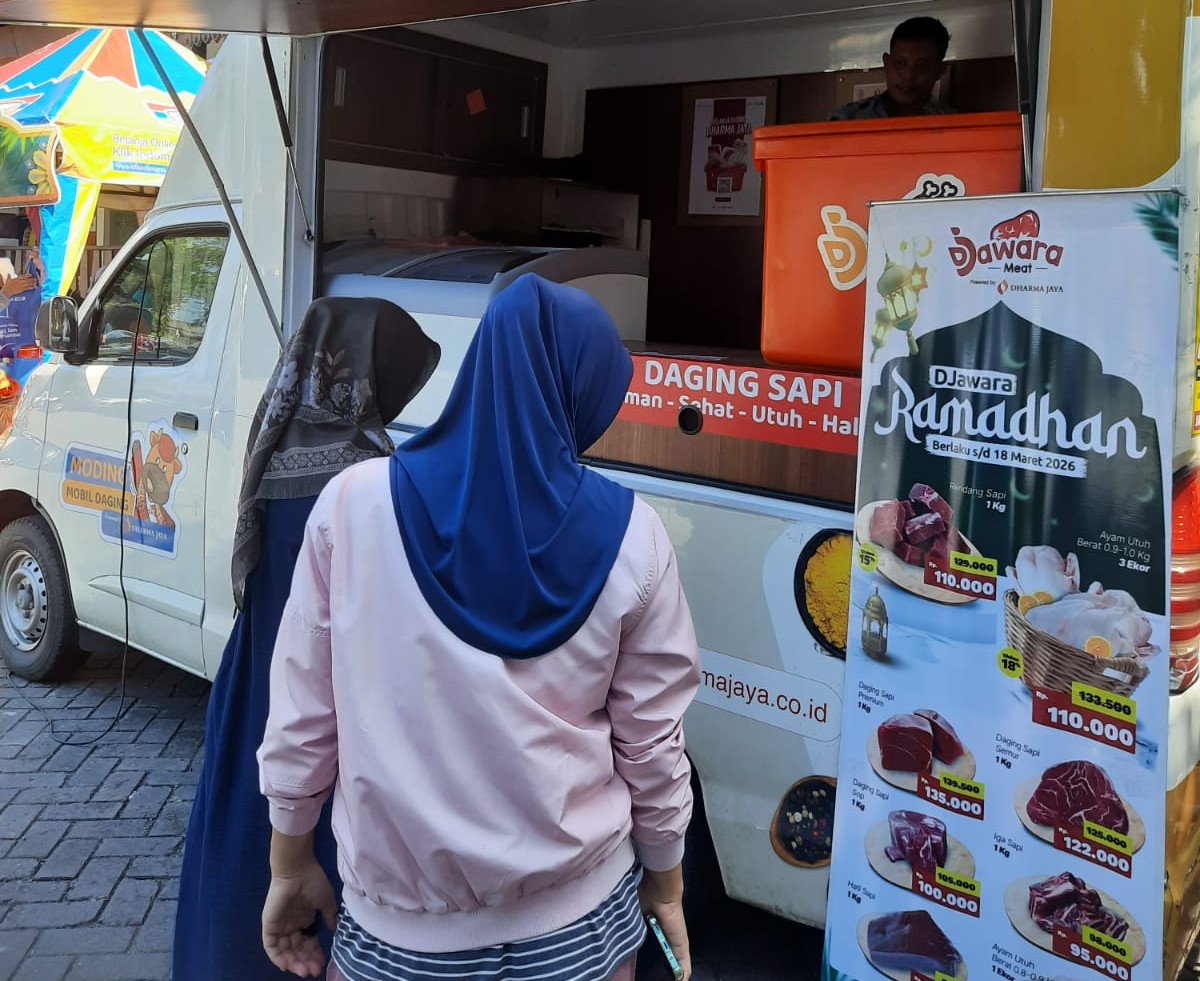 "Untuk penjualan daging, Dharma Jaya menyediakan sebanyak 200 kg daging sapi dan 100 kg daging ayam. Sedangkan pangan murah tersedia dalam bentuk paket. Paket 1 berisi beras 5 Kg, 5 pcs indomie goreng,stick roll, dan syriop (4 goodybag), paket 2 berisi biskuit monde, sirup, gula dan stick roll (50 goodybag), serta paket 3 berisi beras 5 kg, gula 1 kg, sirop, 5 pcs Indomie (119 goodybag). Total 173 goodybag," ujarnya.