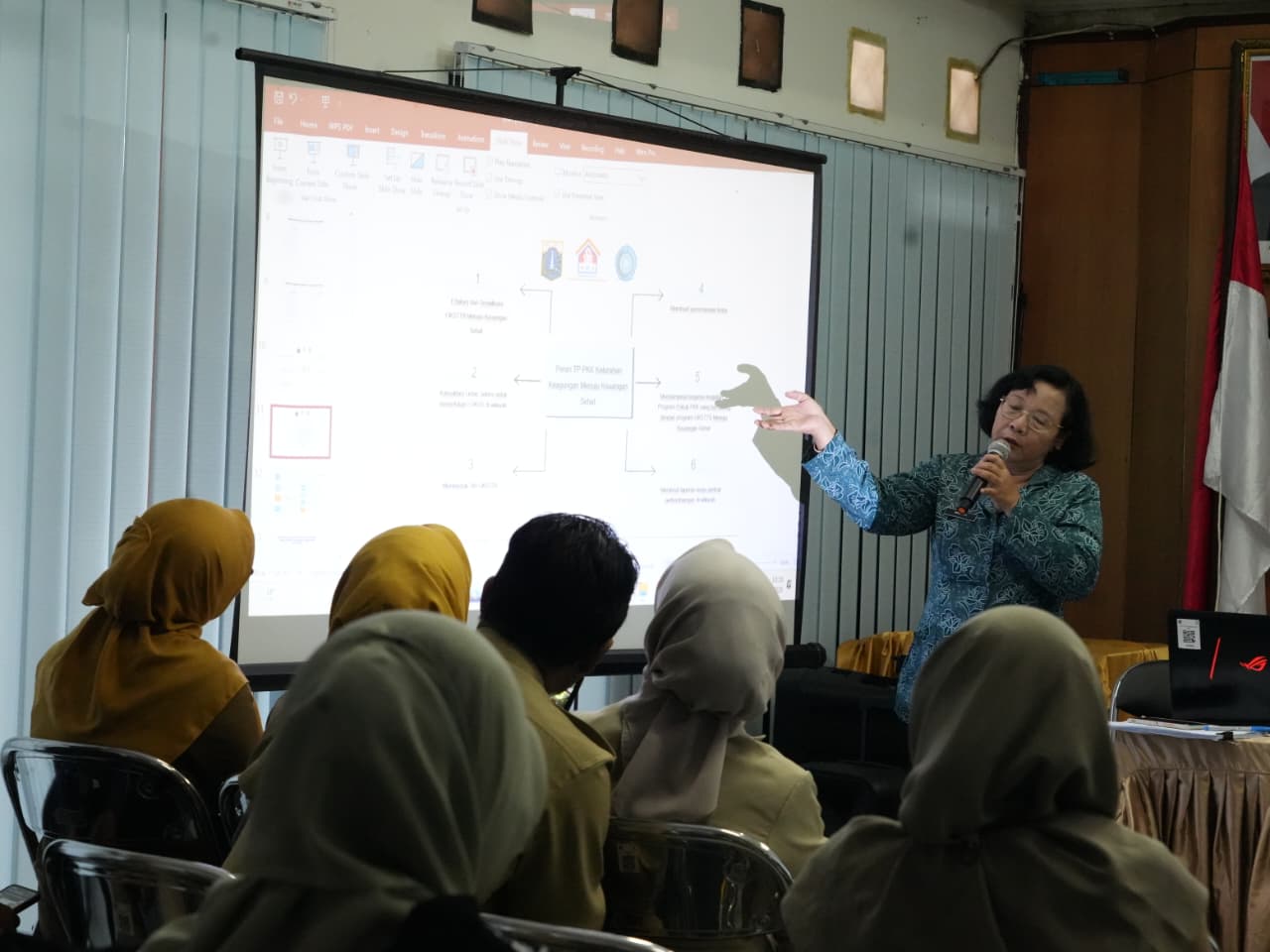 Ketua Pokja 4 bidang kesehatan keluarga dan lingkungan TP PKK Kota Jakarta Barat, Sri Mulyati melakukan rapat kordinasi dalam rangka persiapan monitoring dan evaluasi (Gerakan Keluarga Sehat Tanggap dan Tangguh Bencana) tingkat DKI Jakarta, di Ruang Aula Kantor Kelurahan Keagungan, Kecamatan Taman Sari, Jakarta Barat, Senin (19/1).