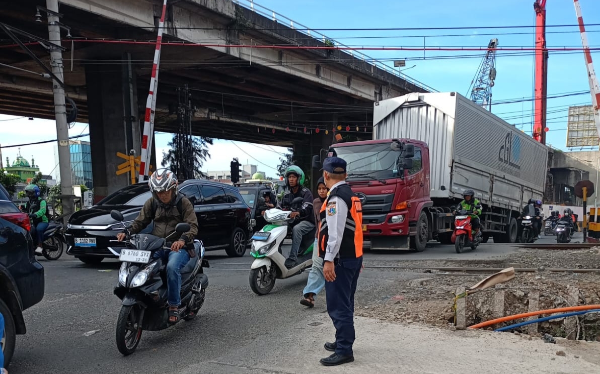 Guna mencegah terjadi kemacetan di area sekitar Flyover (FO) Jalan Latumeten, Grogol, Suku Dinas Perhubungan Jakarta Barat mengera...