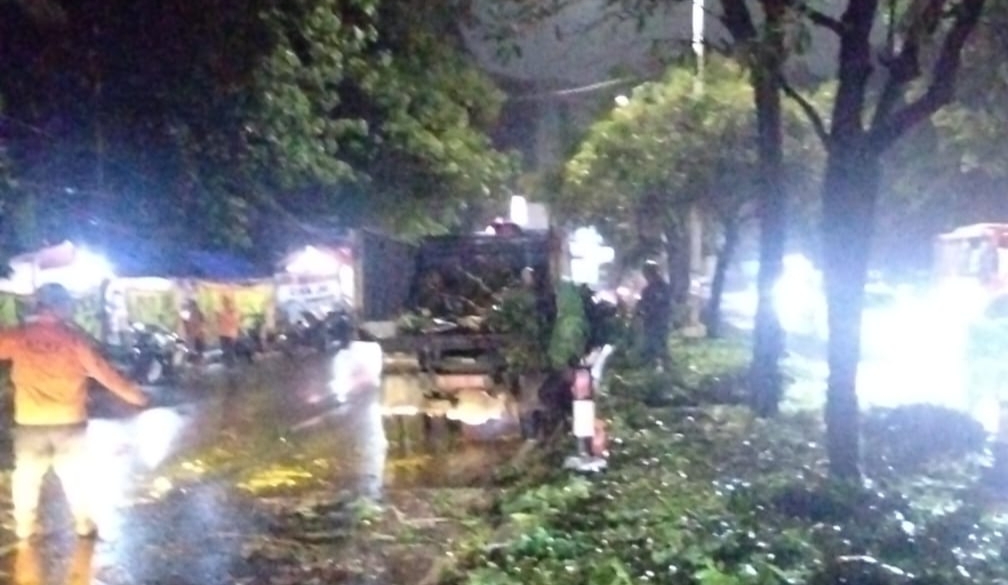 Suku Dinas Pertamanan dan Hutan Kota (Tamhut) Jakarta Barat mengerahkan tim toping untuk mengevakuasi pohon tumbang di Jalan Joglo...